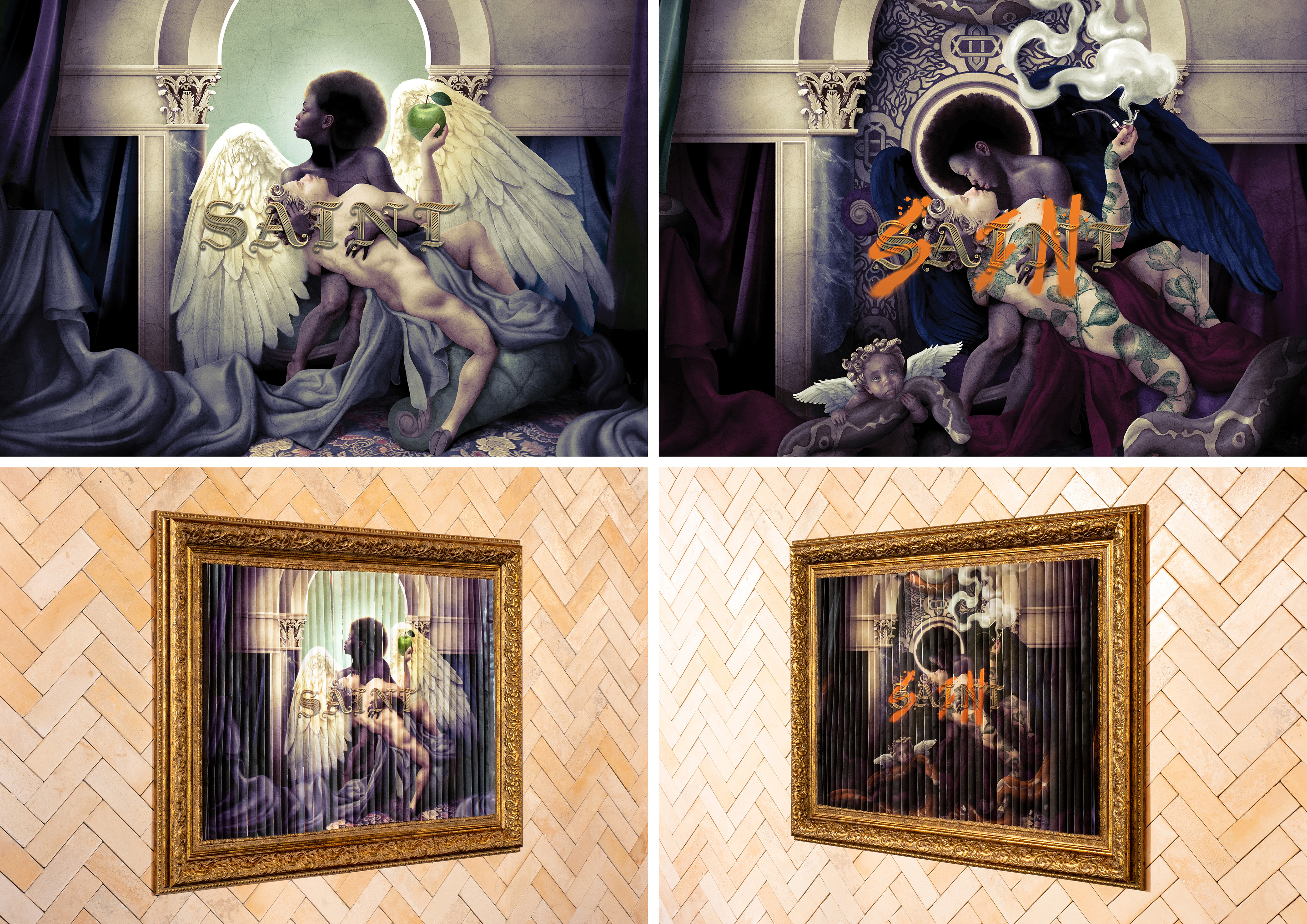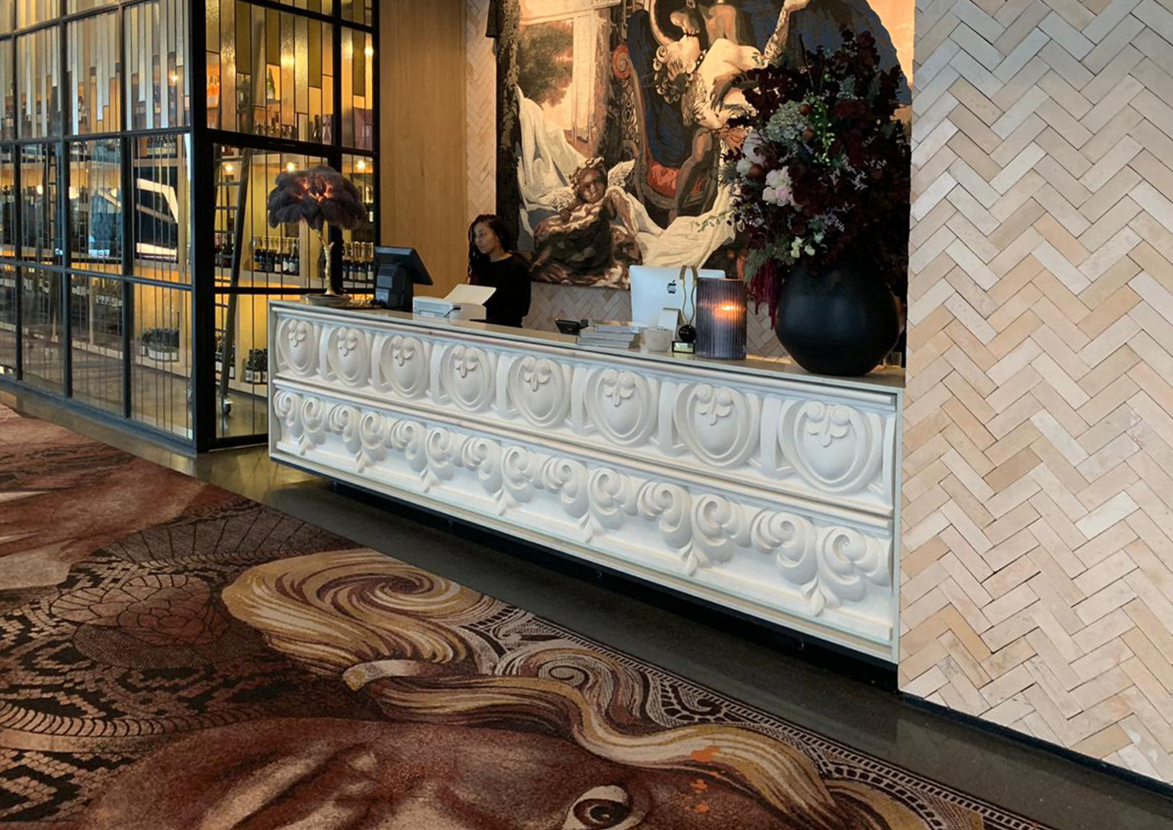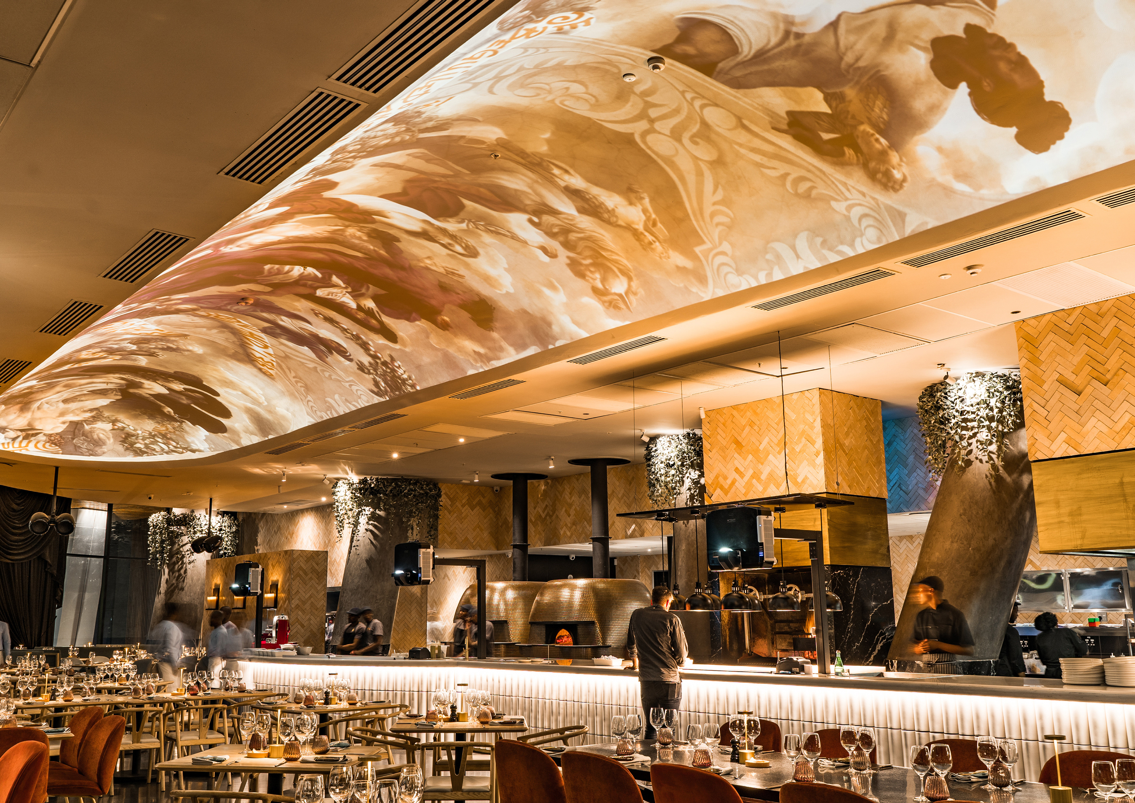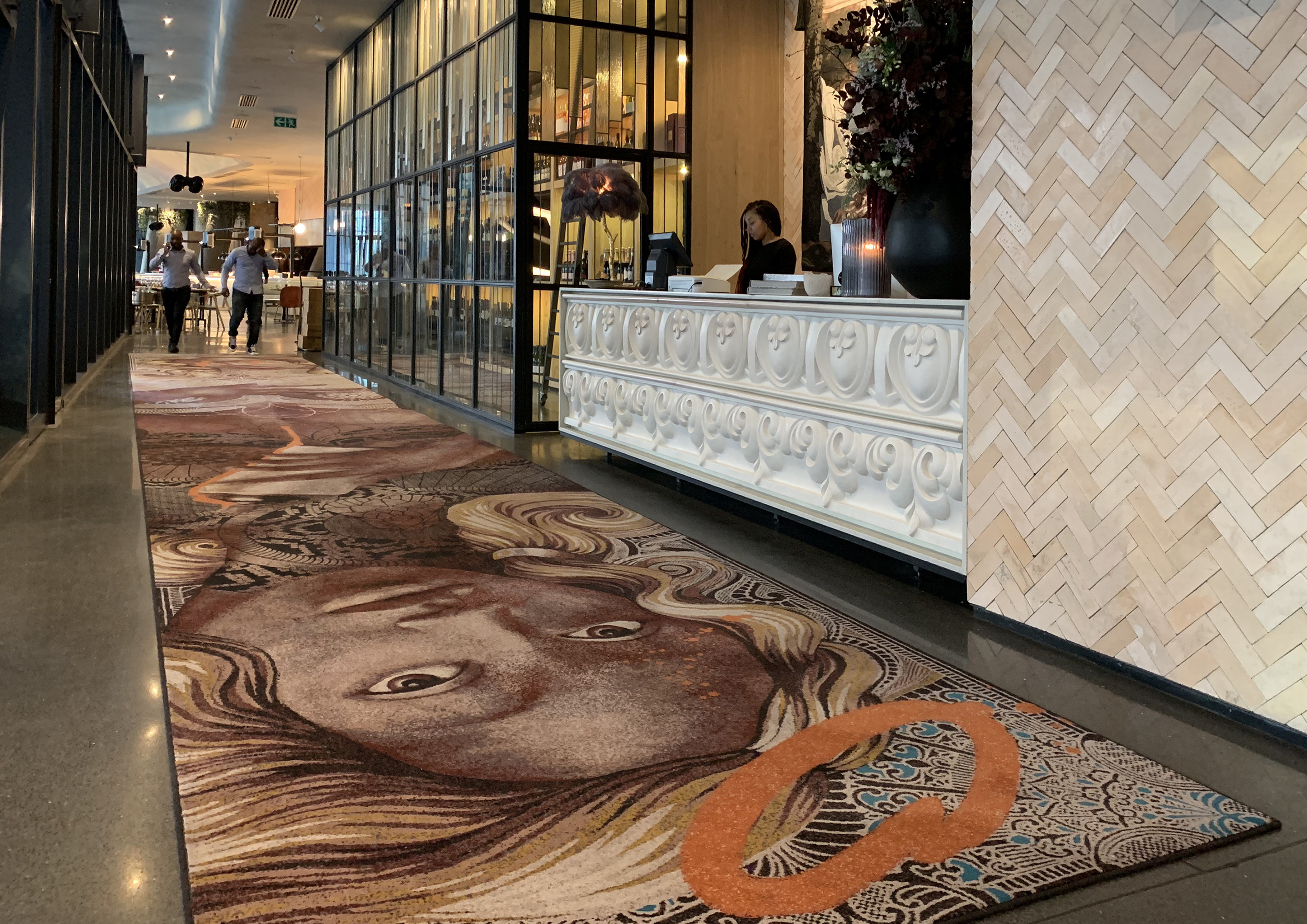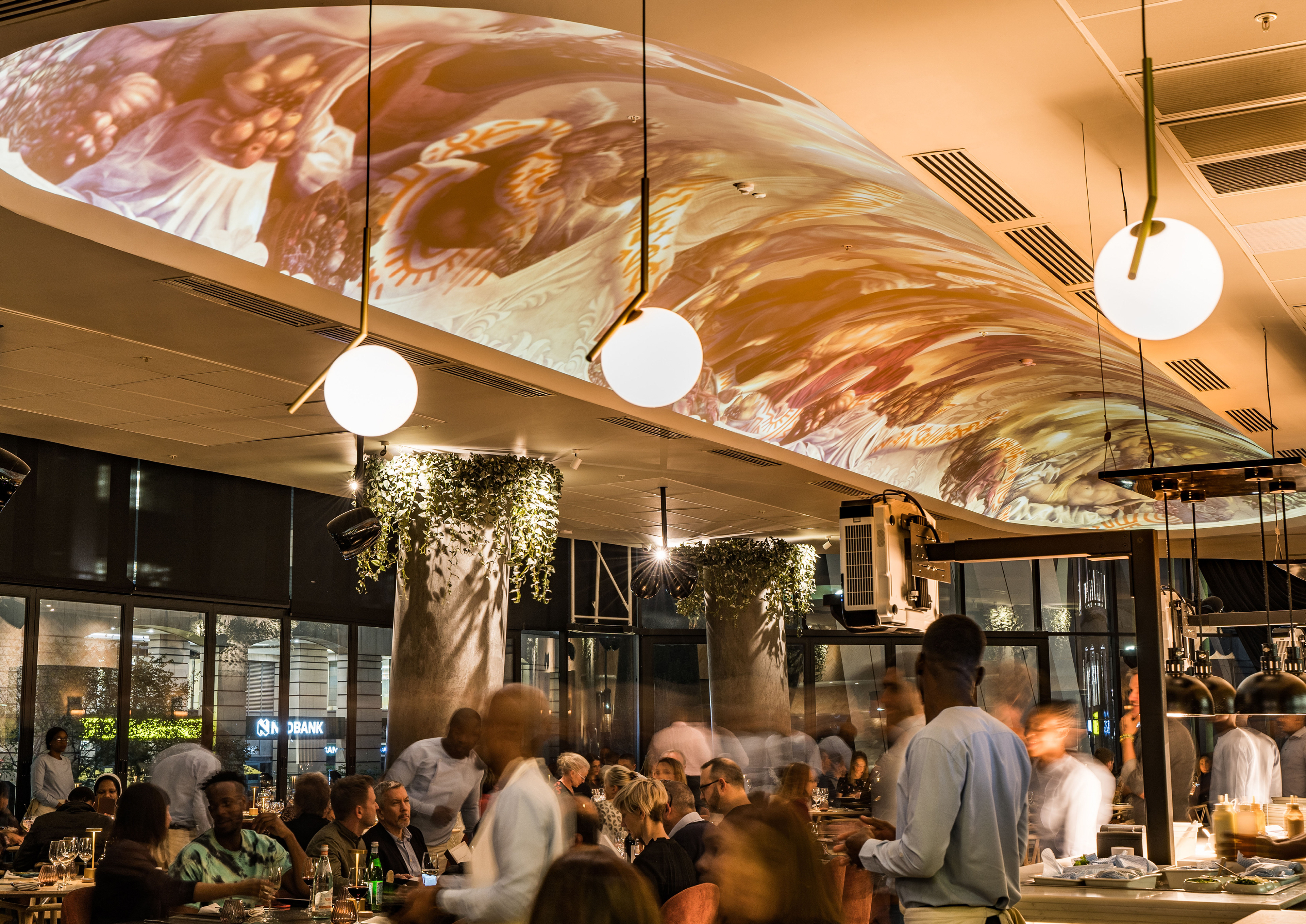 Signature tapestry, carpet and ceiling projection artwork for the interior of Saint Restaurant at The Marc in Sandton. Project done with Grid Worldwide.